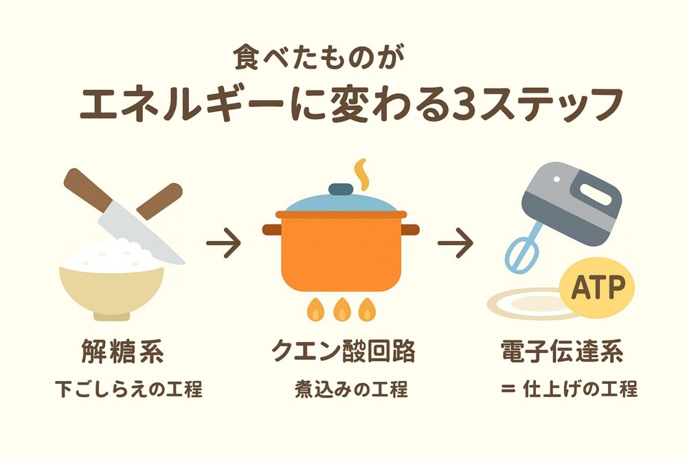 ~食べたものがエネルギーに変わる3ステップ:解糖系 → クエン酸回路 → 電子伝達系~