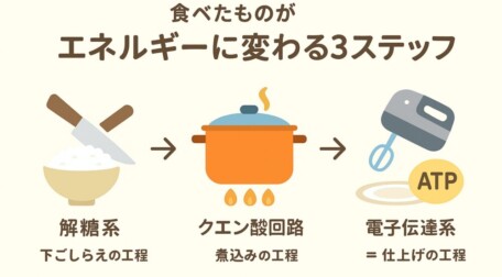 体内で食べ物がどのようにATP(エネルギー)に変わるかを、料理の流れにたとえてやさしく解説。解糖系・クエン酸回路・電子伝達系のつながりが一気に分かります。